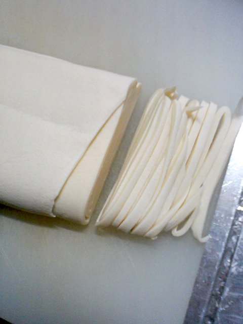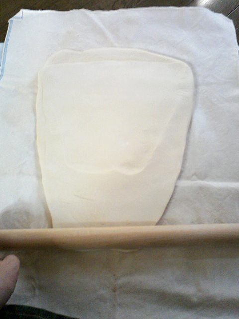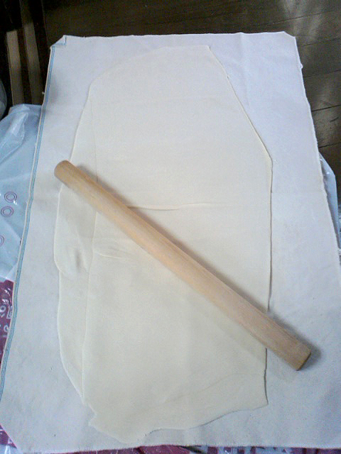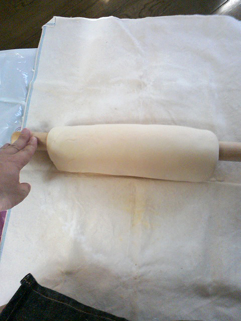 まずは上の写真のようにクルクルと麺棒にまきつけながらのばしていき...