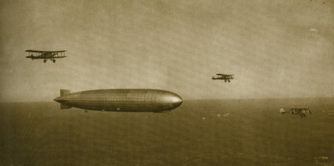 これは旧帝国海軍の軍用機に先導されて霞ヶ浦へ向かう途中のツェッペリン伯爵号