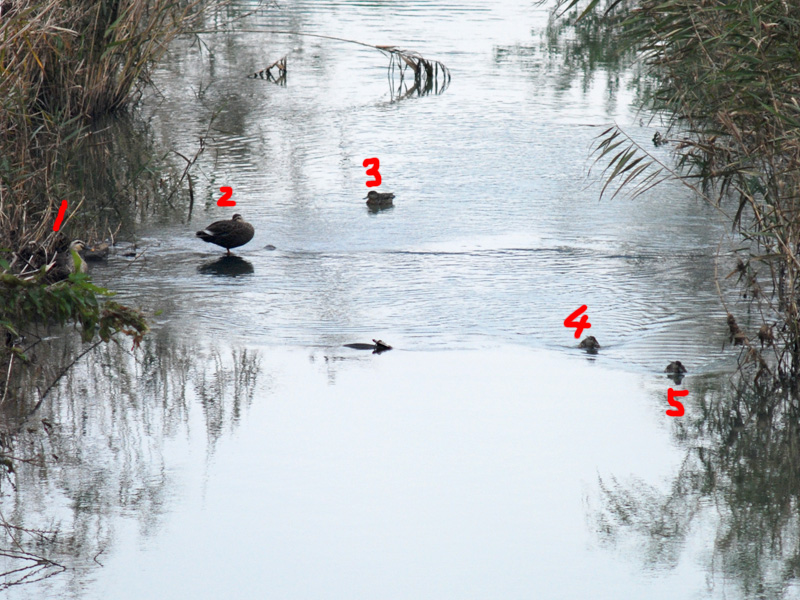 1と2が親ガモ。3〜5が子ガモでしょうねぇ...きっと(推測)