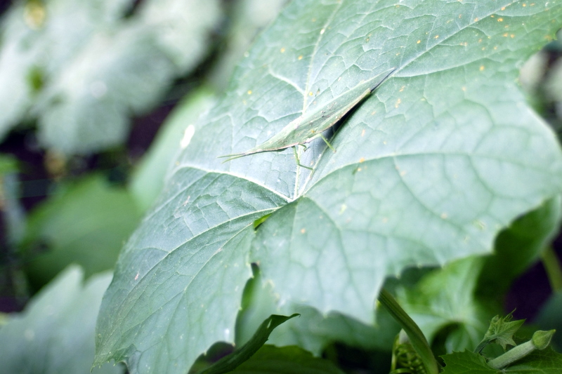 写真は植物園のヘチマの葉っぱにへばりついてるバッタ。