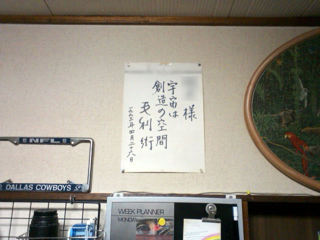 「宇宙は創造の空間」と書いて下さいました。我が家の家宝ですぜ。